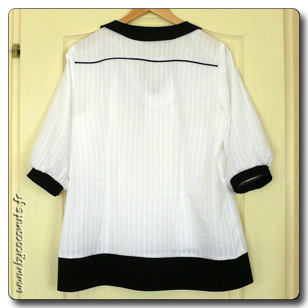 Dernière modif, les manches 3/4 avec un bracelet de manches ouvert. Pourquoi ? Le tissu étant léger, ce haut est le compagnon idéal des beaux jours, donc pas de manches longues. Et la version, manches retroussées- boutonnées, a un petit côté masculin qui ne me plaisait pas avec ce modèle.